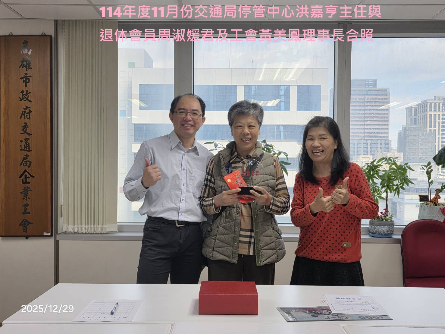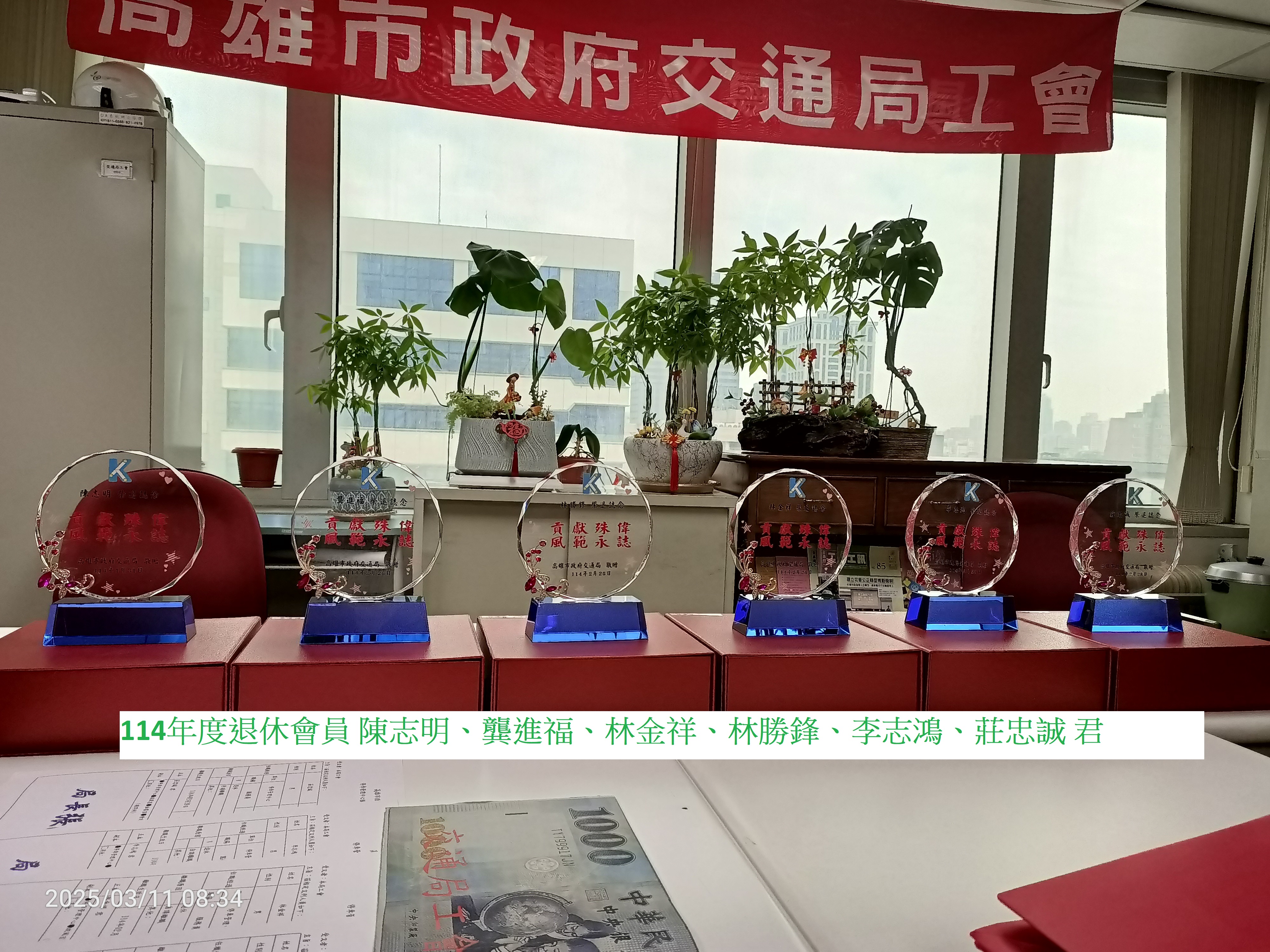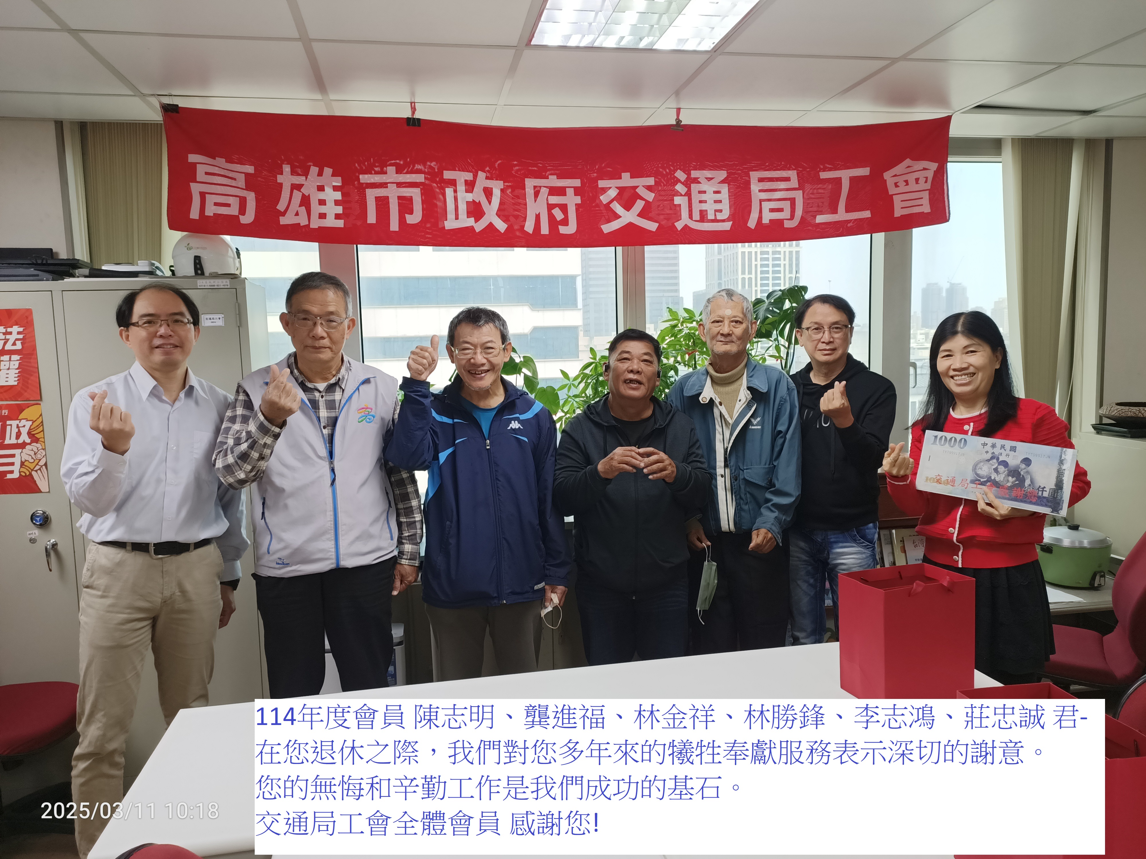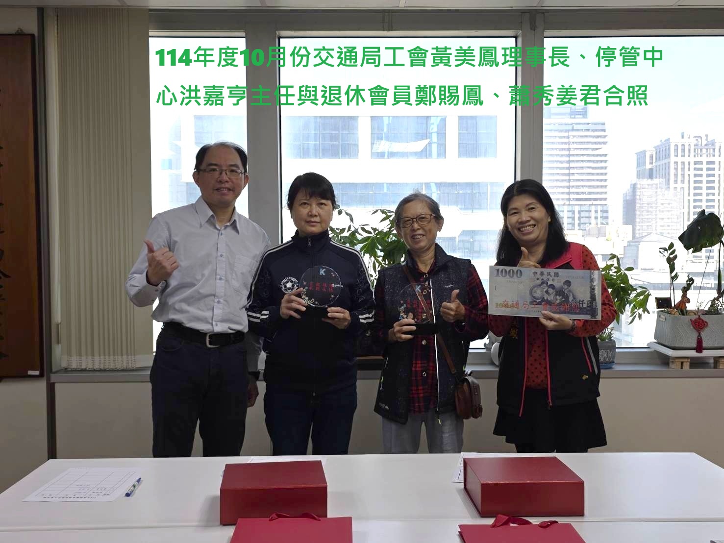 114年度由交通局頒發服務紀念獎盃乙座。工會發給退休會員(禮金壹仟元整);退休會員李志鴻、林金祥、林勝鋒、莊忠誠、陳志明、龔進福、紀懿瓊、楊王淑真、劉國龍、馬美惠、陳秀麗、林素真、黃鈴玲、郭蕎溱、林鳳美、胡秦鳳、莊素蘭、鄭賜鳳、蕭秀姜、周淑媛君。
