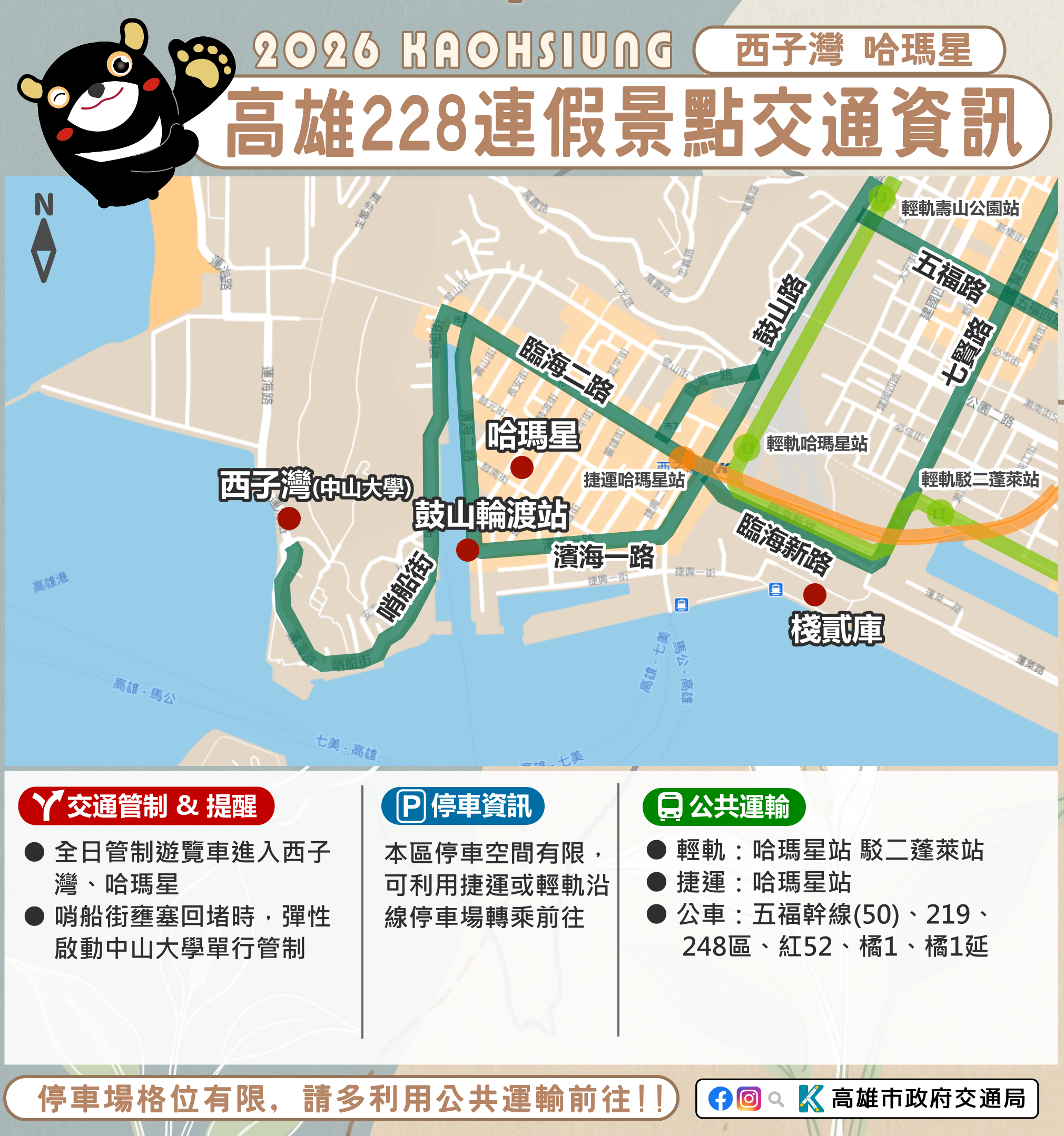 交通局特別呼籲,連假人車多,行經路口務必減速慢行並禮讓行人,嚴禁酒駕;行經輕軌路口務必遵守號誌及轉向管制。出門前可多利用高雄市即時交通資訊網(https://traffic.tbkc.gov.tw)、省道即時交通資訊網等查詢即時交通路況,並適時行駛替代道路。市府相關景點及活動交通管制資訊可至市府Line、臉書、市府交通局(https://www.tbkc.gov.tw/)、「轉動高雄青春夢」及「高雄旅遊網」等臉書查詢。預祝大家行車平安、假期愉快!