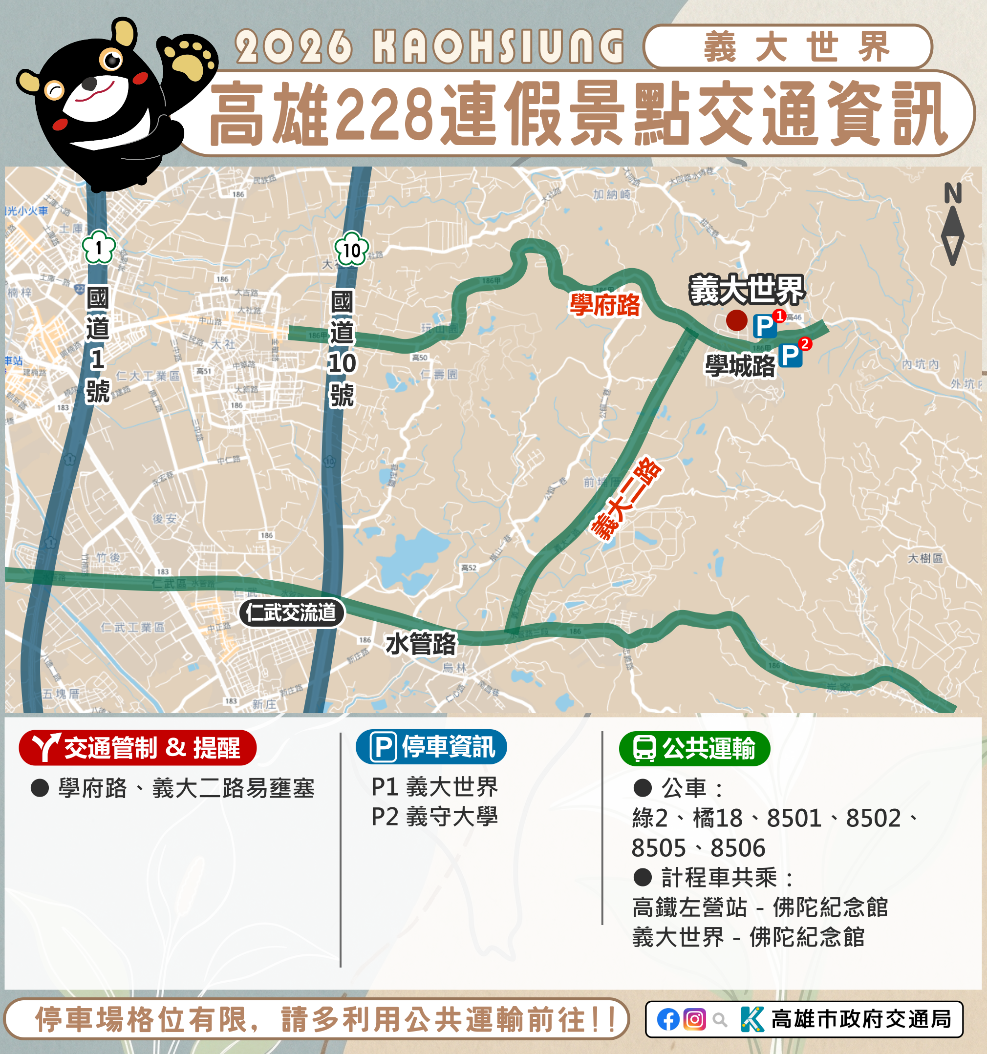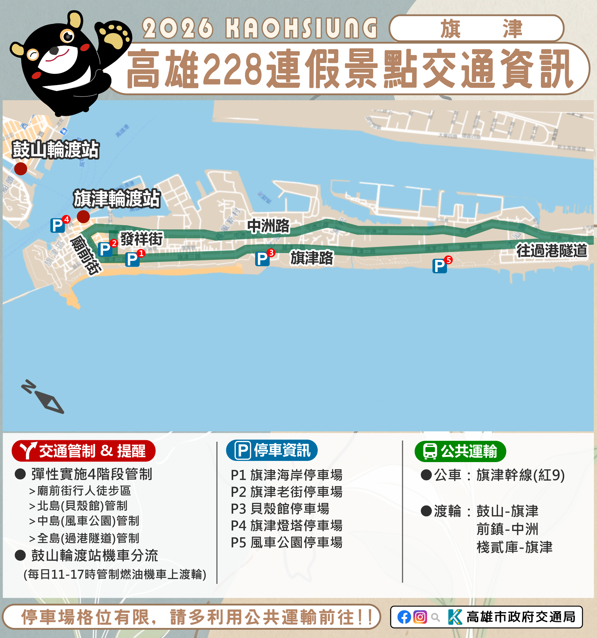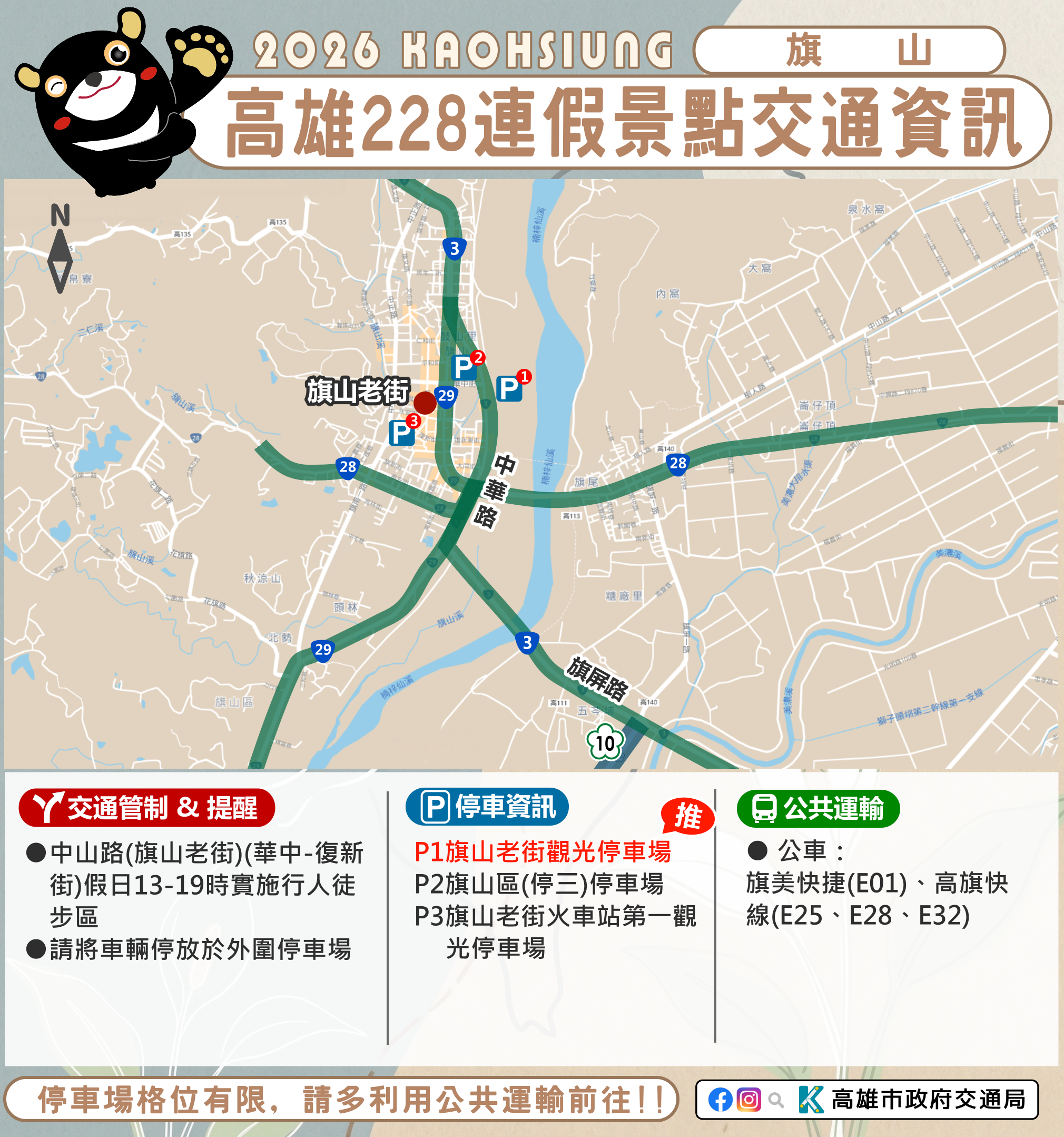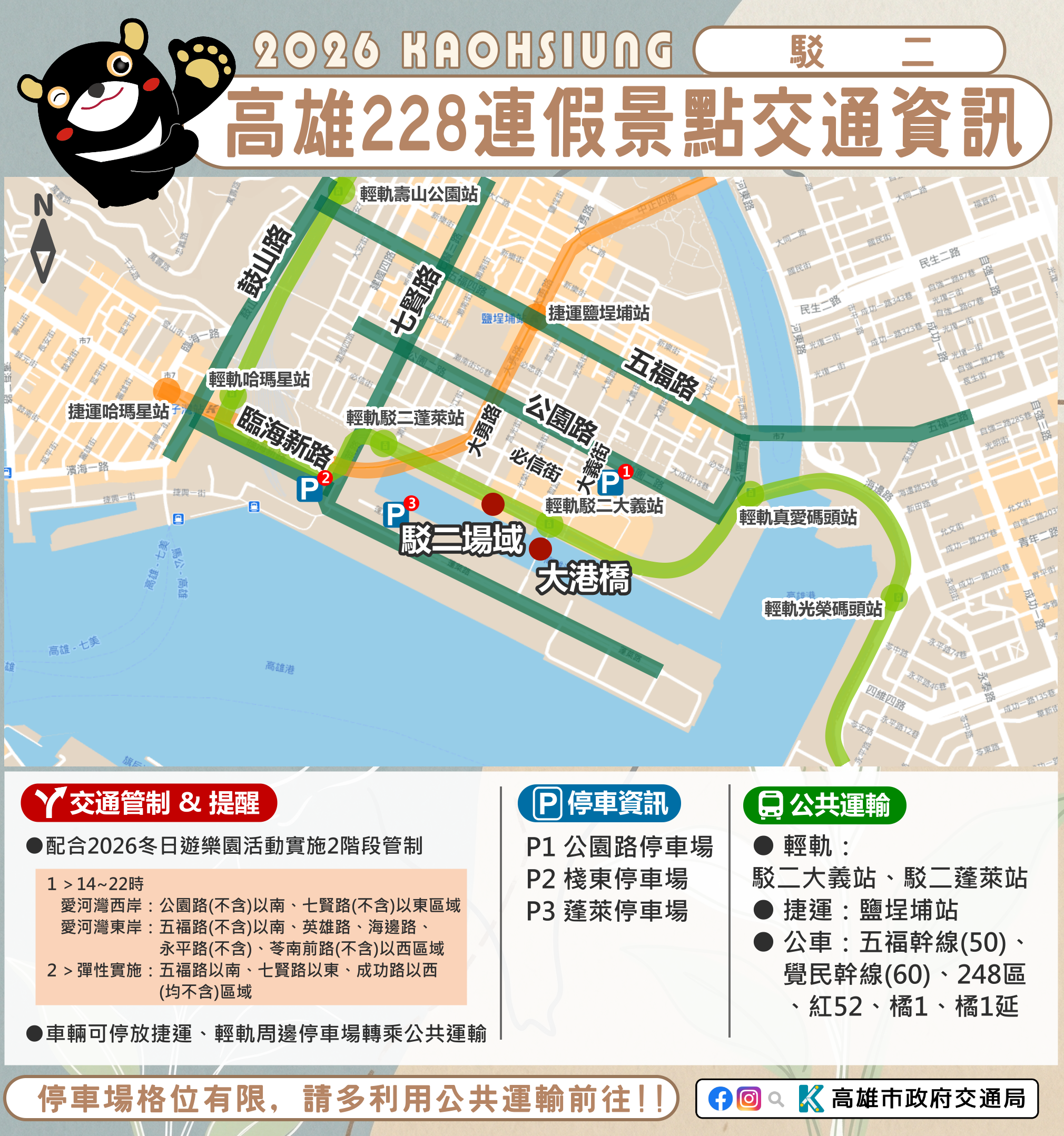 今(115)年228連假自2月27日至3月1日共計3天,預期返鄉、出遊人車潮多,元宵節將近,高雄市包括旗山、美濃、佛光山、旗津、西子灣、哈瑪星、駁二等傳統觀光景點預計將湧入大量人潮,市府將依交通狀況實施交管措施,「2026 Kaohsiung Wonderland 高雄冬日遊樂園」周邊道路亦將實施階段性交通管制,請民眾出遊前先查詢景點交通資訊及替代道路,避免塞車影響遊興。