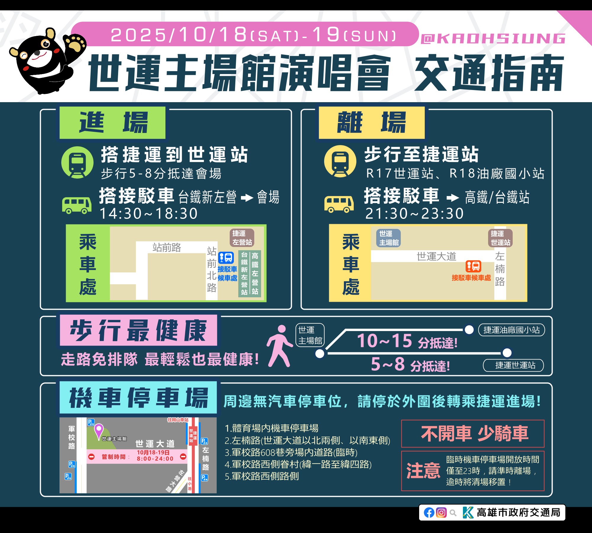 本次活動機車臨時停放區規劃於世運主場館西北側、軍校路西側(世運大道至海功路)及軍校路西側眷村(緯一路至緯四路),開放時間為10月18日、19日8時至23時,騎車前往的歌迷可多加利用、務必準時離場。另會場依照慣例「絕不提供汽車停車位」,請民眾千萬不要開車來,以免因為找不到停車位延誤進場時間。